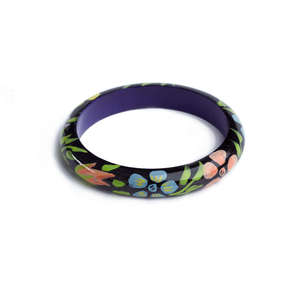 This hand-painted and lacquered bangle is crafted from 100% recyclable Wrightia Tinctoria a plant native to India. Featuring pink and blue flowers painted on black background, it has a contrasting navy-blue interior. Available in small, medium and large widths.