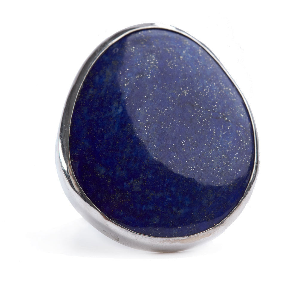 This dramatic, oversized handmade ring has a distinctly organic appeal with its smooth tumbled Afghan lapis lazuli stone that begs to be touched. It is set in sterling silver.